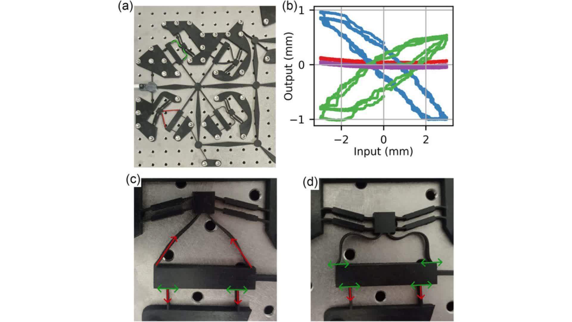 测试还发现了材料的一些实际限制。由于橡胶的粘弹性特性,材料表现出滞后现象,不过在较慢速度下这种效应会减小。此外,材料的性能受到梁长宽比的限制——在真实材料中,产生较大矩阵权重的大角度设计也会使输入路径变硬,从而减少输出端的运动幅度。