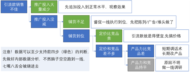 有了扩展报表以后,就能解读出深入业务含义。比如只说:“商品A销售未达标”,你啥都理解不了。但是说:“新上市的引流款商品A销售不达标”,你马上就能联想到以下情况。从产品力/推广方式/投入力度/一线执行等多角度,具体归因(如下图)。