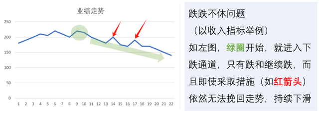 这种情况,其实是“全部大幅下跌”的缓和版。本质就是行业/公司出了底层问题,在苟延残喘而已。但是!有些领导并不认命,他会认为“只是某一件事没做好”,没有彻底改革的勇气。此时,你会发现,这个走势继续断断续续下跌,跌跌不休。