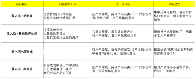 收入上升不代表万事大吉,四大保障指标(毛利/营销投产比/应收/库存)也得一起看。有一些经典的问题组合(如下图)。